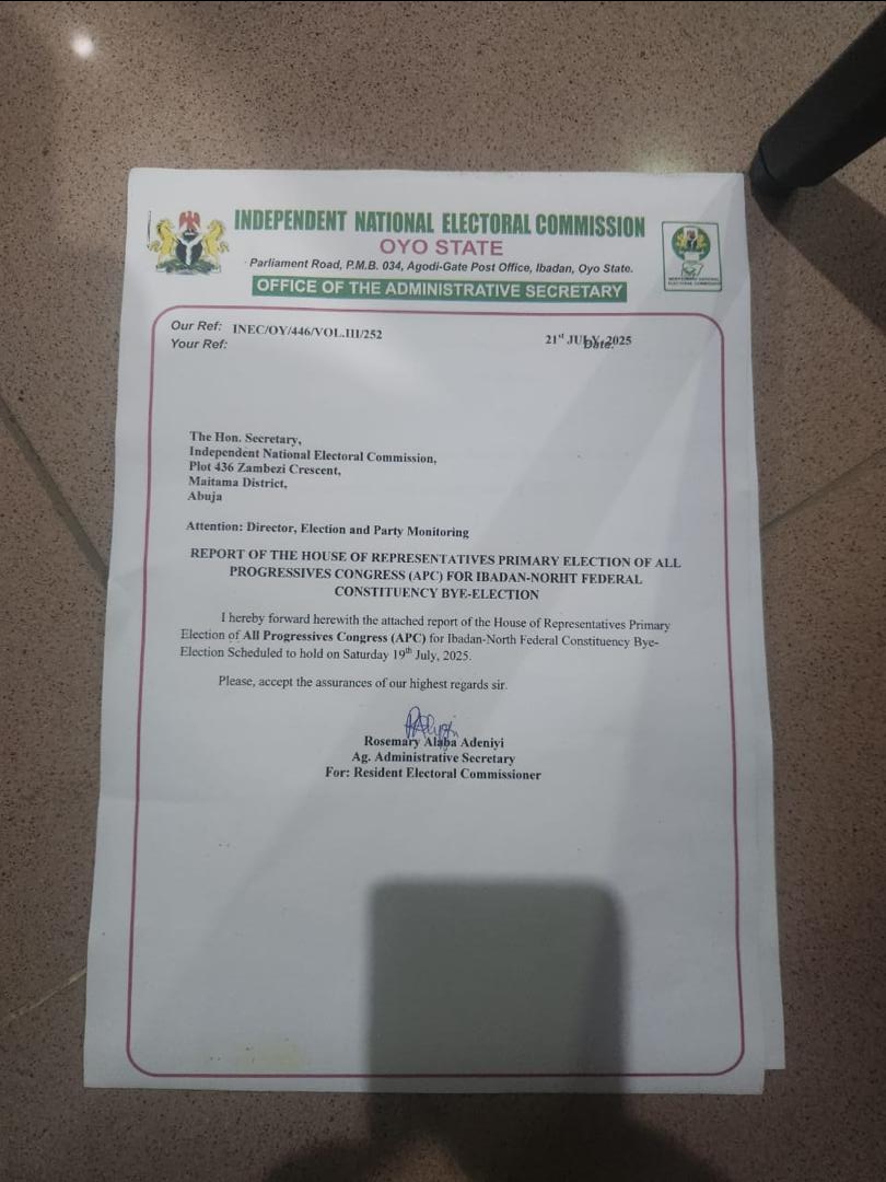 The memo, dated July 21, 2025, and addressed to the Director of Election and Party Monitoring at INEC headquarters in Abuja, was signed by Rosemary Alaba Adeniyi, the Acting Administrative Secretary for the Oyo State office of the Commission. It officially states that the scheduled APC primary election did not hold.