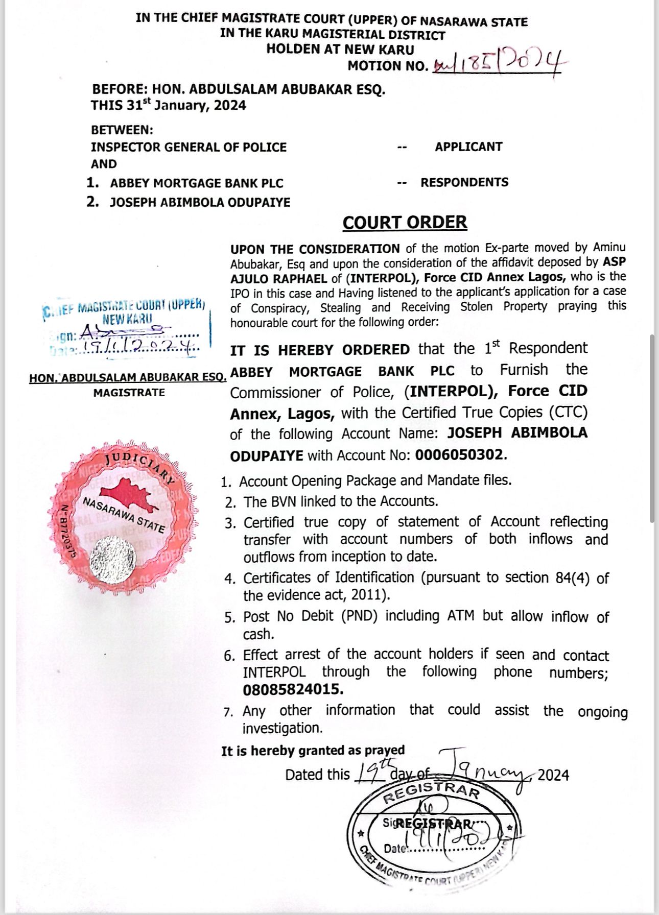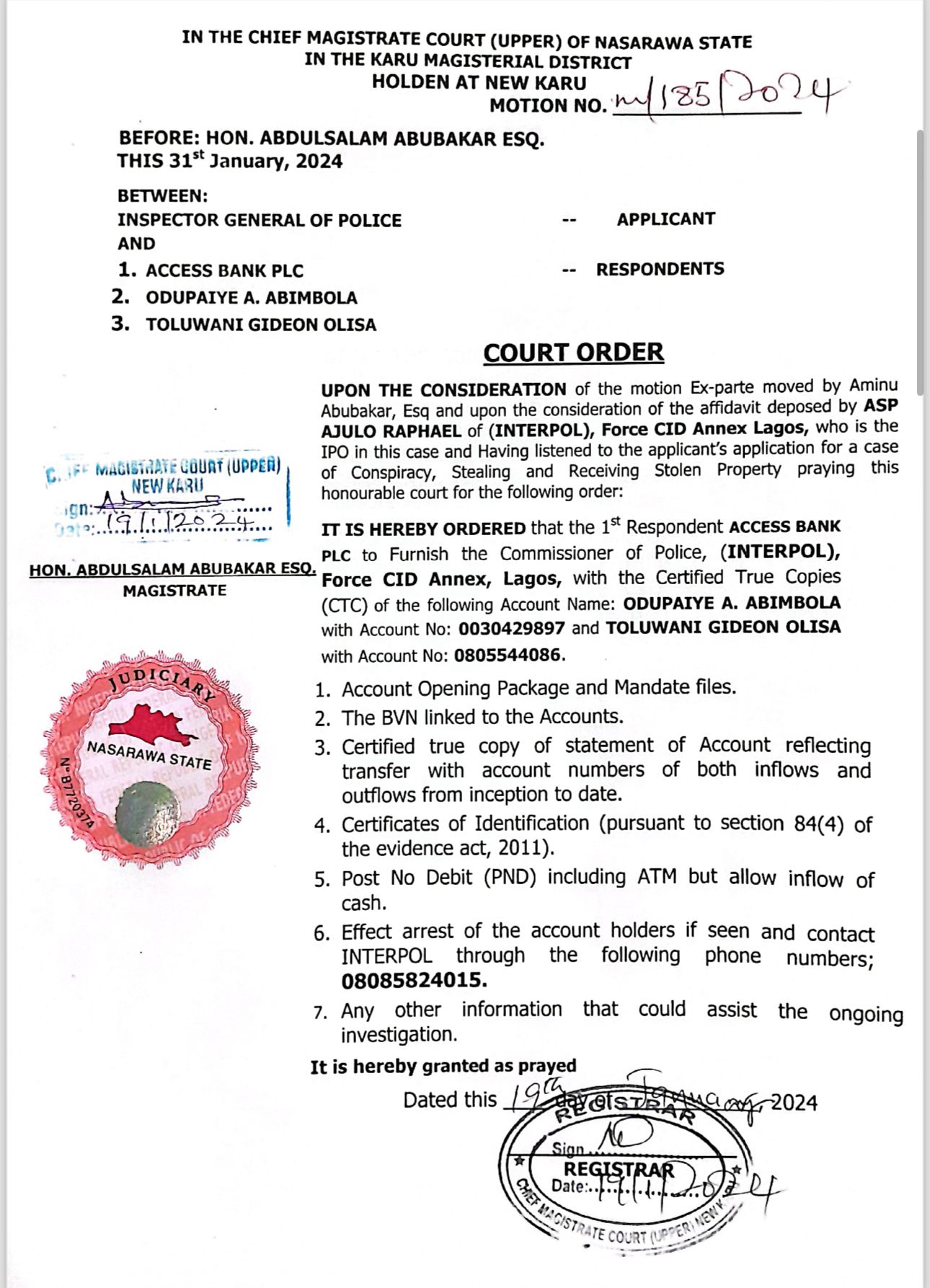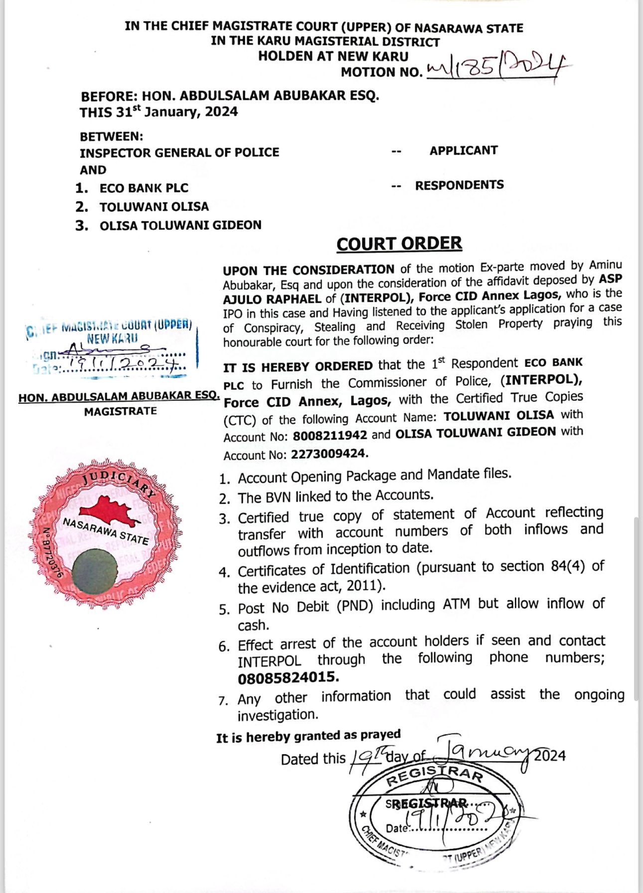 Chief Magistrate Abdulsalam Abubakar on Jan.19 ordered that upon the motion ex-parte moved by one Mr. Aminu Abubakar and upon the affidavit deposed to by ASP Ajulo Raphael of (Interpol) Force CID Annex Lagos, Fidelity Bank, First Bank, Eco Bank, Polaris Bank, Wema Bank, Abbey Mortgage Bank, Access Bank, Guaranteed Trust Bank and UBA should furnish the commissioner of police (interpol)of the account details of Toluwani Gideon Olisa and Odupaye Abimbola Joseph.