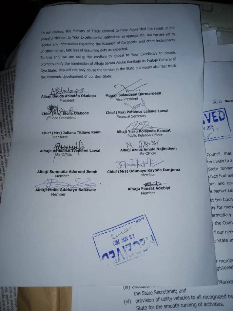 The statement reads, “Our attention has been drawn to the raging disagreement amongst the traders and artisans in Oyo State generally, concerning the issue of Iyaloja in General of Oyo State, by our understanding, the tussle is between two contenders, namely, Alhaja (Princess) Azeezat Folashade Nurudeen and Alhaja Saratu Aduke Konibaje.”