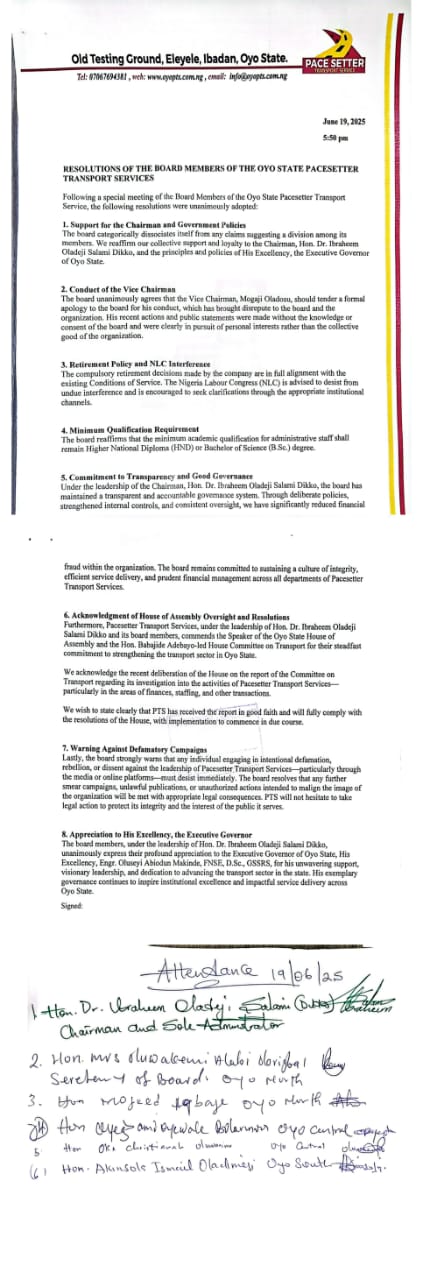 The Board of the Oyo State Pacesetter Transport Service (PTS) has reaffirmed its unanimous support for its Chairman, Hon. Dr. Ibraheem Oladeji Salami Dikko, while pledging continued alignment with the progressive policies of Governor Seyi Makinde’s administration.
